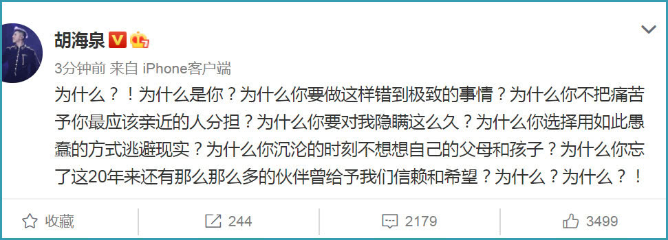 作为“羽泉”组合之一的陈羽凡于28日在北京因XD被捕,堪称2018年年末第一大瓜,作为搭档的胡海泉随后表示无比痛心,在V博上连用了十个为什么质问,这其实也是很多喜爱“羽泉”,喜爱陈羽凡的粉丝的心声。