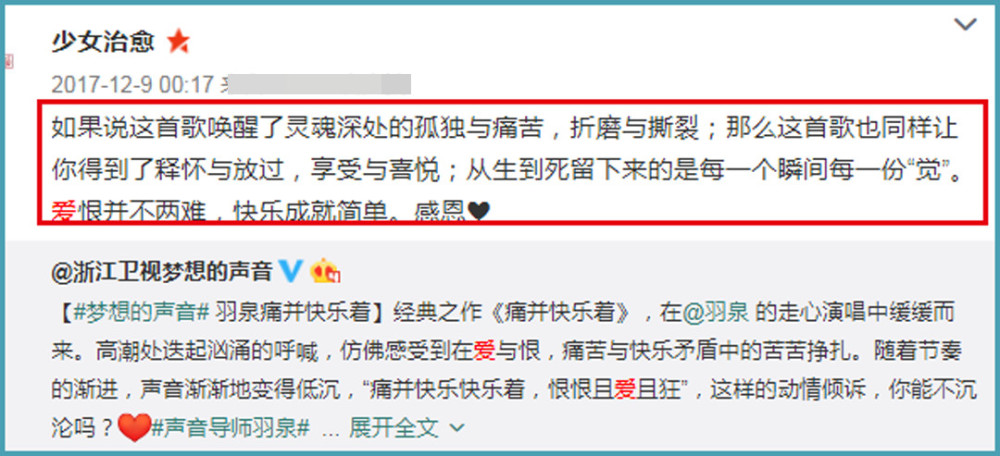 在2017年12月,何时珍同学点赞了“羽泉”在节目中演绎的《痛并快乐着》,并称“爱恨并不两难,快乐成就简单,感恩”。