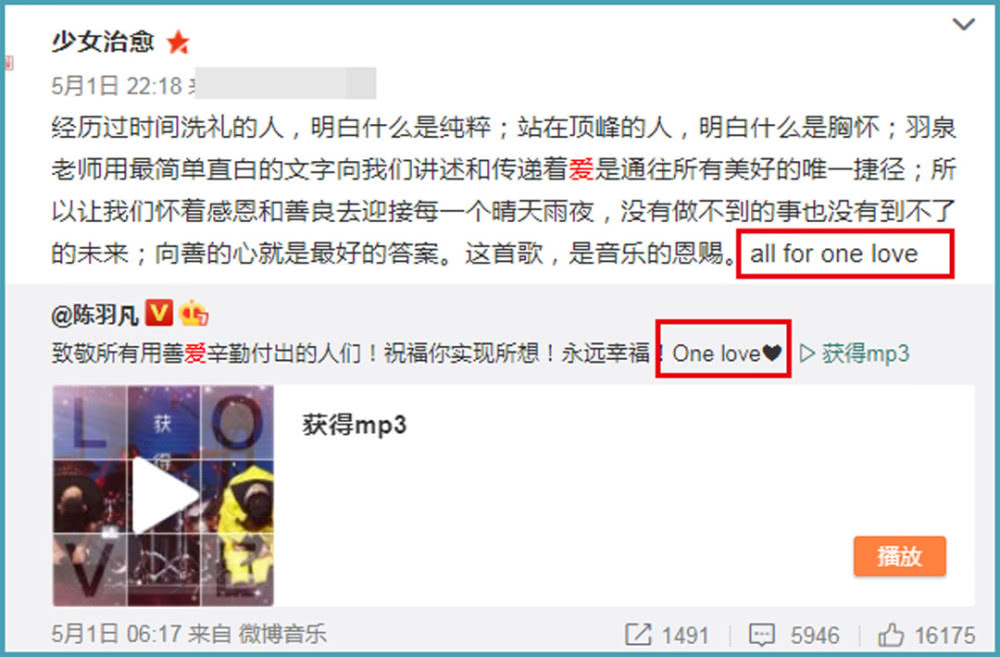 从这个已曝光的V博来看,何时珍与陈羽凡有过不少互动,其中最令人瞩目的是其在2018年5月1日与陈羽凡的一个恋爱密码“one love”,这个英文陈羽凡曾在个人社交平台中不断的写过,并且也不断的写过包含有“珍贞真”的动态,两人隔空传情的意图已经很明显。