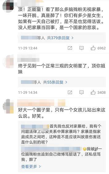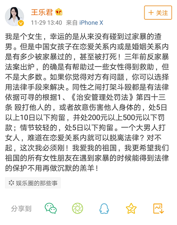 很快就有人在在王乐君的微博下声讨王乐君,留言希望王乐君将来也被家暴,更有甚者将这件事上升到了民族与民族之间的历史矛盾上,甚至想要挑起民族仇恨,真的是让人唏嘘,站出来为被施暴者发言反倒成为了错误的一方,但是还是有很多人站出来为王乐君发言,点赞王乐君三观正,之前在电视剧《伪装者》中王乐君饰演的程锦云作为胡歌的官配甚至还不如宋轶饰演的爱慕者的人气高,甚至还有人说她是“最丑女主角”。