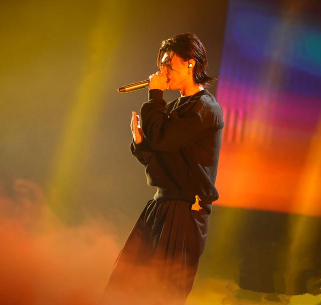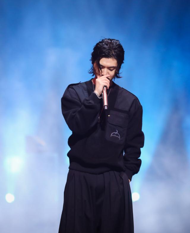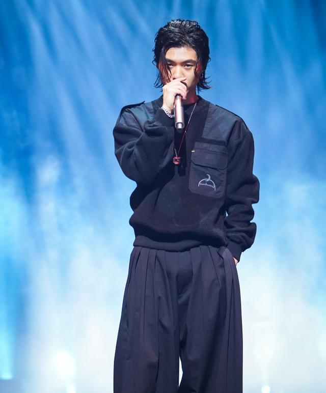 宫阁上衣是一件黑色的卫衣,设计虽然简约但是也是非常个性的,搭配了一角深蓝色宽松的长裤,一只手拿着话筒一直手插在口袋里面,眼神只是前方非常的认真,这眼神真的是有一种“小狼狗”的既视感啊。
