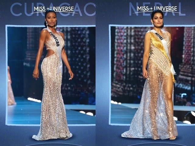 第八、九名为库拉索姑娘akisha albert和尼泊尔姑娘manita devkota,两人同穿亮片礼服裙,大秀健美身材。manita的薄纱礼服裙非常加分,透视裙摆秀出她健美的双腿,犹如雕塑一般完美。