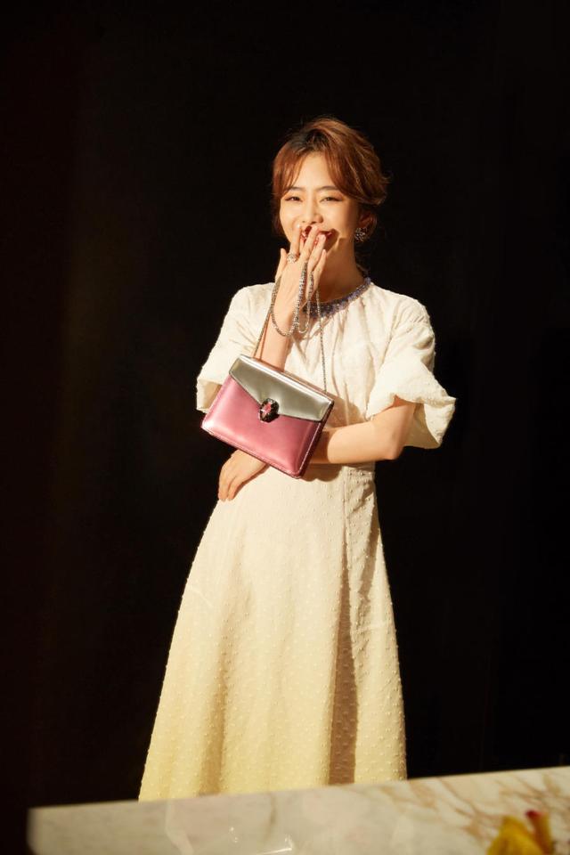 这位就是谭松韵了,笑起来十分温暖的她总是给人的感觉十分的甜美和孩子气,看起来格外的天真浪漫,仿佛长不大一样,将头发盘起来的她丝毫不显老气,十分精致的八字刘海更是将她的脸型修饰的十分的小巧,精致的面容在妆容的点缀下更显光彩夺目,而她身上所穿着的这件米白色长裙更是小清新十足,白色的上衣搭配上米色的半身裙,简单又不失优雅,给人一种田园优雅的美感,而她手中拎着的这个粉色的链条包包也是十分的可爱,跟她甜美的气质十分的搭配。