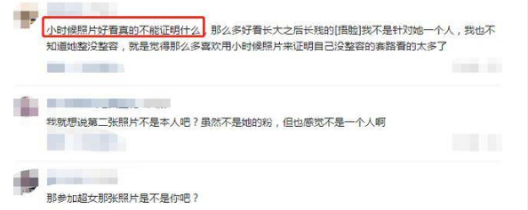 不过对此,仍然有些网友不买账,表示“小时候照片好看真的不能证明什么,那么多好看的长大后长残的,不是针对她一个人,就是觉得用小时候的照片来证明没用,套路。”还有人问“那参加选秀的照片是不是本人?感觉不是一个人啊。”、“那张照片是不是你吧?”