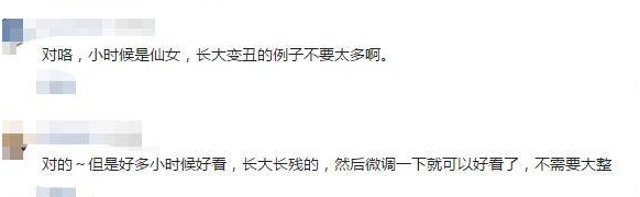 还有网友赞同“小时候照片不代表长大后的样子”的说法,表示小时候好看的多了,但是长大长残的也很多。“、”长大变丑的例子不要太多。“
