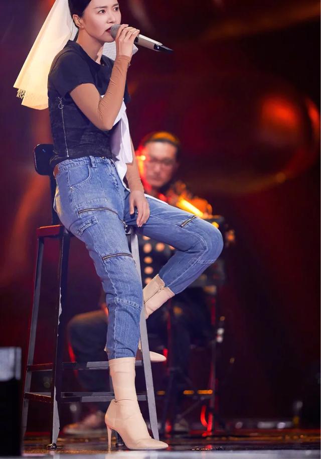 谭维维近日晒出的照片中,自己正手持话筒歌唱,裤腿却亮了,有网友们发现谭维维把牛仔裤脚扎进短靴里,直呼个性,敢穿,时尚太时尚!