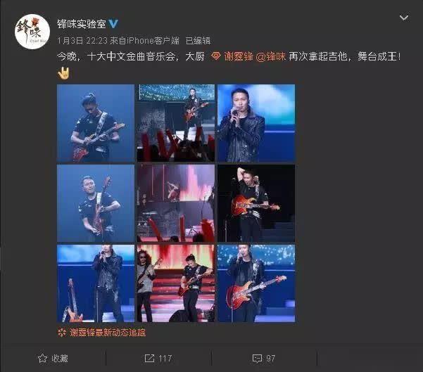 在1999年仅19岁的谢霆锋就已经出道并被观众所认可,当年也首次翻唱《光辉岁月》,一起致敬黄家驹,把大家带入了深深的回忆中。随后他带来了第二首歌曲,也是自己的一手新歌《青空》,当他唱完第二首歌曲后,谢霆锋转身脱掉皮衣,上演吉他秀。最后,演唱了经典歌曲《潜龙勿用》,成为了全场的焦点,拉开了今晚音乐会的序幕!拿起吉他的谢霆锋,由大厨转变为舞者,也满足了无数粉丝的梦想!当晚粉丝们纷纷留言,期待已久的歌手谢霆锋终于回来了!