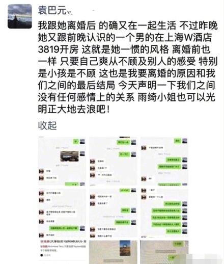 而近日,张雨绮和前夫袁巴元又闹起来,疑似袁巴元的朋友圈发文爆料张雨绮的各种黑料,他坦然直言张雨绮在和他离婚后又拿孩子求他复合,他答应了,但是最重要的是,前夫哥紧接着说,在和他复合之后,前妻又有了新的男友,还有才认识一天的新男友去开房!前夫哥指出这是她一直以来的风格,离婚前也是一样。