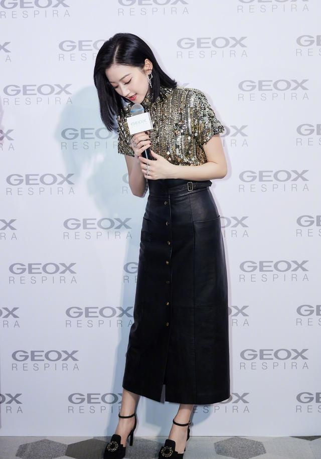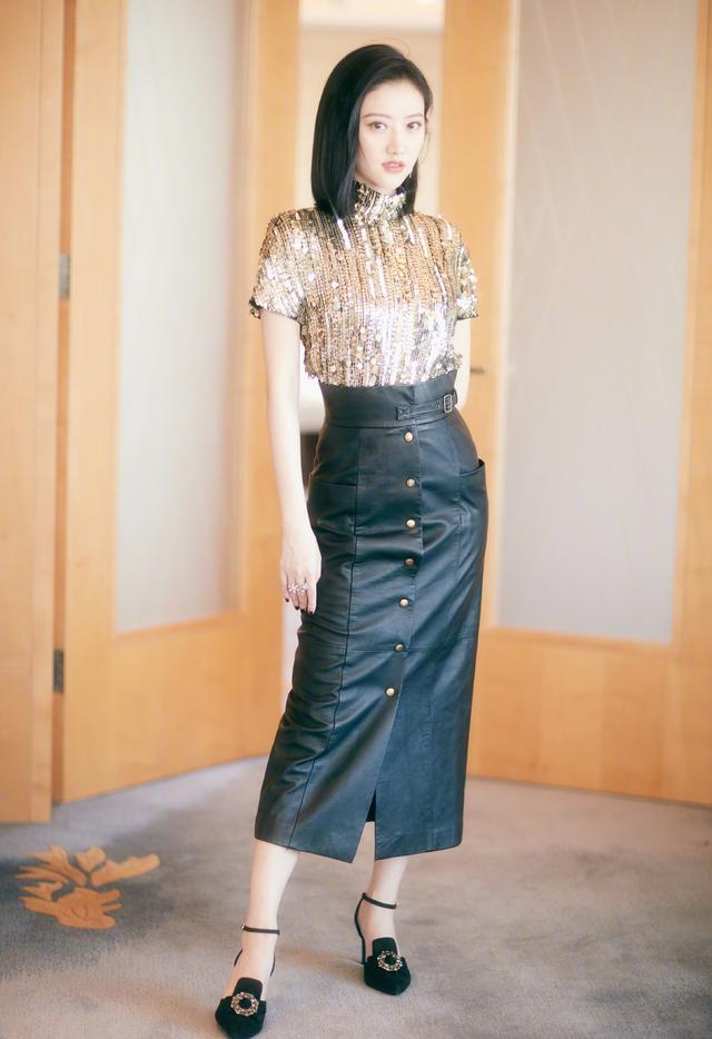黑皮半身皮裙也是经典的黑色单品,提升气质上效果不错,景甜穿着黑色的半身长裙,上面穿着金色的短上衣,这样一身穿搭时髦又优雅,长长的皮裙也显得下半身腿长许多,整体造型看起来身材不错。