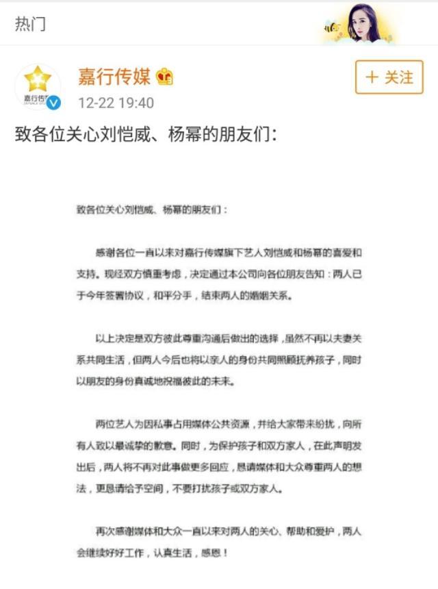 嘉行传媒发声明宣布刘恺威杨幂已于近期离婚,二人属于和平分手,未来将以朋友的关系继续相处,并共同抚养女儿小糯米。