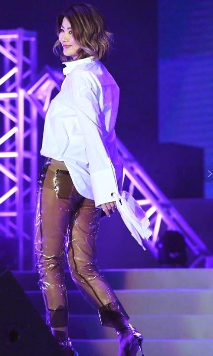 她身上穿着一件简单但很有时髦感的衬衫,但是下身配的裤子,真是让人欣赏不来。这种裤子可以说是七分裤的样式,但是质地却属于透明包包薄膜,看起来好像我们经常在雨天穿的雨衣,这种设计真的让一般人接受不了。