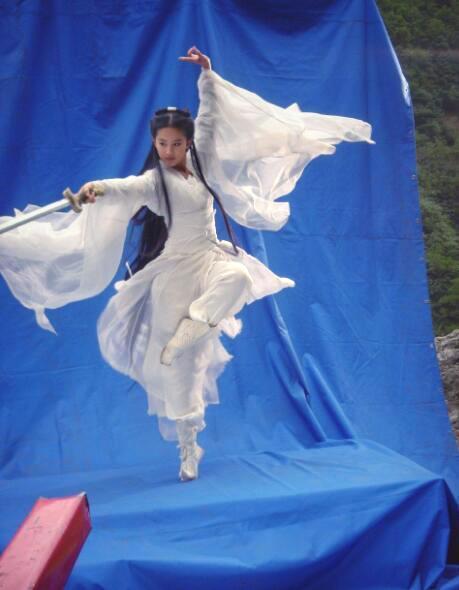 这张是未经处理过的照片,她的身后并没有威亚,一只脚撑起了整个身子。这样的动作对平衡力的要求非常高,刘亦菲看起来却丝毫不费力,并且这个舞剑的动作看起来还非常优美。