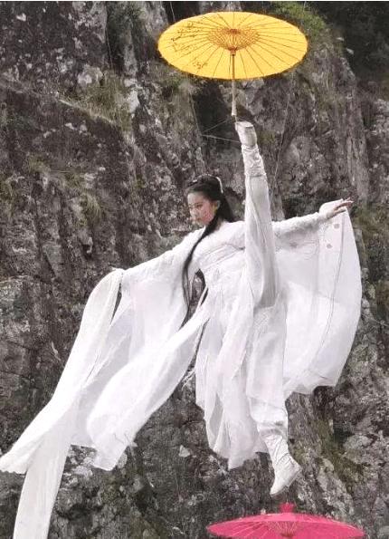 小龙女有一场和李莫愁的打戏,在剧中两人在空中借助伞完成动作。这个动作需要一只脚站在伞上支撑身体,另一只脚还得撑起另一把伞,难度也是非常高的。