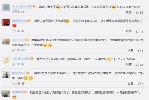 粉丝纷纷表示:胡歌这身民国装扮好帅啊,沉迷于颜值难以自拔,他们俩同台演话剧还是很有看点的,非常喜欢胡歌永远支持胡歌愿你永远像仙剑里面那样年轻帅气一位非常有实力的演员笑起来很有感染力的一位男明星,舞台上的胡歌老师闪闪发光,魅力四射!