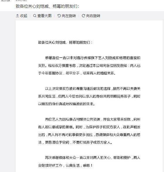 12月22日,杨幂所在公司“嘉行传媒”发声明宣布杨幂刘恺威于今年签署协议,和平分手。两人就此结束了将近5年的婚姻。虽然过去传言了很多次,但是这次真的成为了现实。