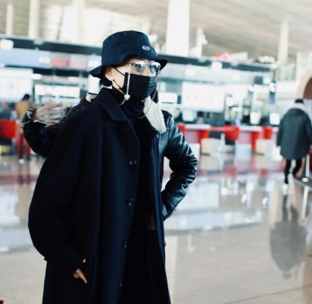 她的套装全都是黑色,完全不符合女性的特点,给人的感觉都是潮流耍酷,假小子劲头十足,戴上帽子再配上口罩这些都不是十分的出彩,但是她的一双眼睛却显得格外的别致,长长的眼睛链子垂下来眼镜链子相当的精致,但是又给人一种桀骜不驯不羁的感觉,紧接着下半身也是黑色的裤子搭配,再加上平底鞋,不过这样的搭配也会显得腿较长,也是一种正确。