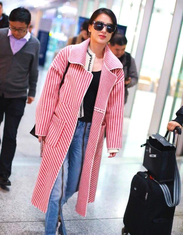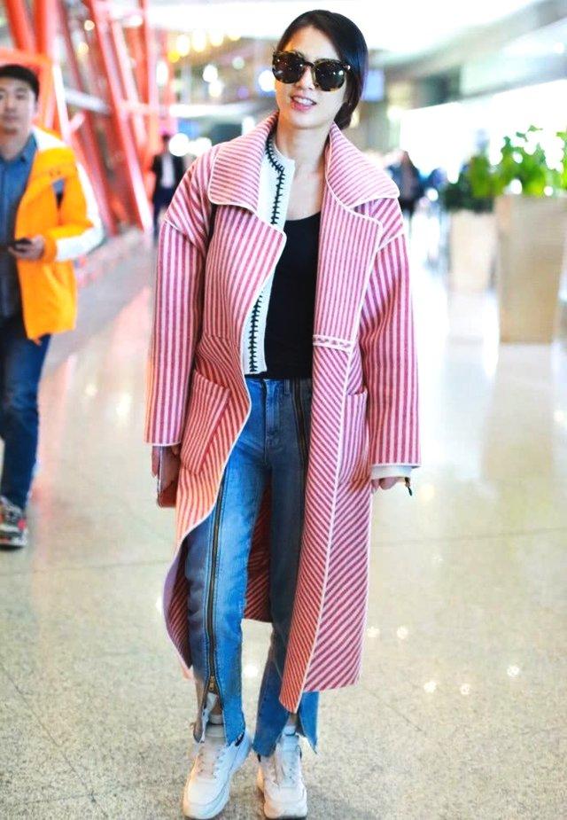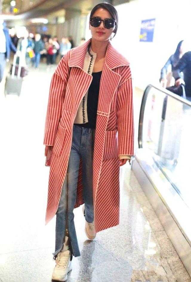 黄圣依身穿一件黑色上衣,外搭一件红色条纹大衣,中间露出白色的侧边,轻松打造出丰富的层次感。搭配一条个性十足的牛仔裤,佩戴黑色墨镜,看起来时髦到飞起,胖一点怎么了,好看就行!