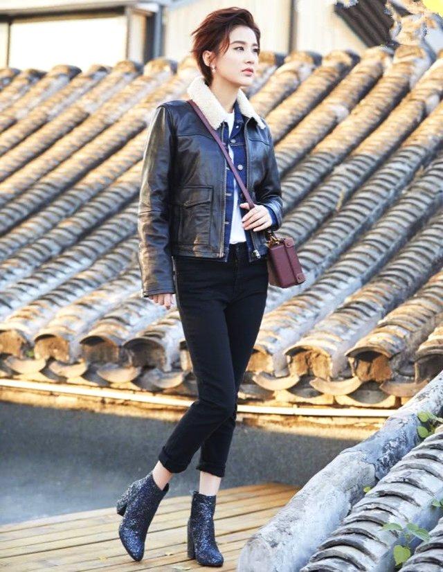 黄圣依的造型百变,一起来看一下她的短发造型吧!黄圣依顶着一头利落的短发,身穿一件黑色皮夹克,内搭一件蓝色的牛仔外套,里面还叠穿了一件白色上衣,层次感十足!搭配黑色的紧身裤,脚踩亮片高跟靴,帅气又时尚!