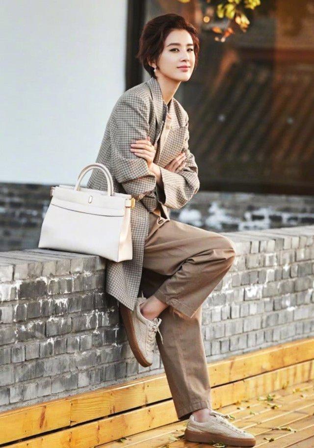 黄圣依身穿一件格纹外套,格纹自带几分复古腔调,搭配一条卡其色的休闲裤,简约随性又不失舒适感。脚踩一双浅色运动鞋,看起来有点脏脏的,搭配上她帅气利落的短发和精致的妆容,尽显女性柔美气质又不乏率性酷感!