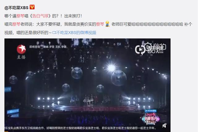 无独有偶,这边腾格尔在北京卫视的跨年晚会唱着蔡依林的《日不落》,那边蔡琴在东方卫视的跨年晚会上唱着周杰伦的《告白气球》。并在歌曲结束后说大家不要怀疑,自己就是货真价实的蔡琴。许多观众可能会认为自己是不是听错了,蔡琴怎么可能会唱《告白气球》,但其实蔡琴已经不是第一次唱周杰伦的《告白气球》,早在草莓音乐节,蔡琴就已经唱过了。
