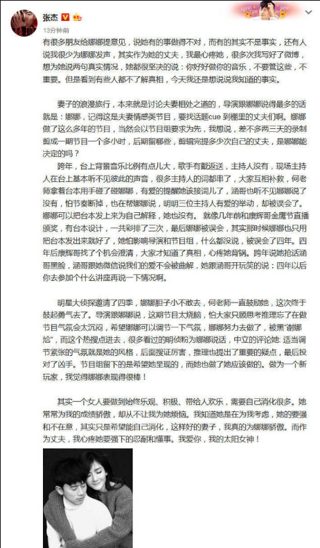 事情过去张杰发声力挺谢娜,并表示谢娜是应导演的要求cue自己;跨年演唱会上谢娜失误,是因为三位主持人在现场相互补救的行为引起了误会;关于“谢娜尬”的热搜,他表示适当调节紧张的气氛就是谢娜的风格。最后他表白谢娜,直言为她骄傲