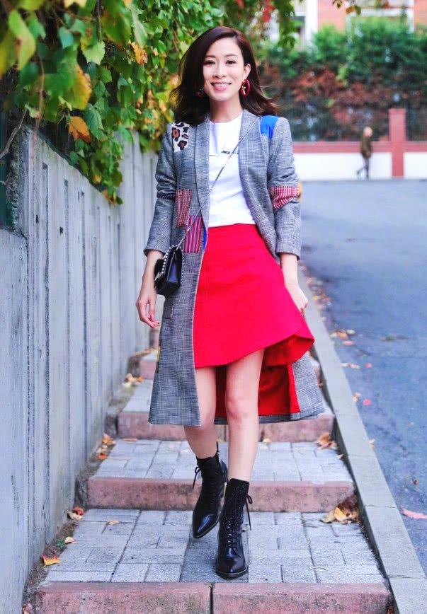 我们来看看走清新风格的佘诗曼吧,佘诗曼秀发披肩尽显清新气息,身穿的是白色短袖搭配红色短裙,脚上搭配的是黑色亮漆长筒靴,外搭的是灰色长款大衣,这样的佘诗曼清新又时尚,很有少女感哦。