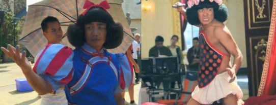 《新喜剧之王》里,为了展现群演的辛酸一面,王宝强还有两个反串角色,除了之前曝光的白雪公主,还有一个是穿着肚兜和短裙的女仆形象,挺辣眼睛的。