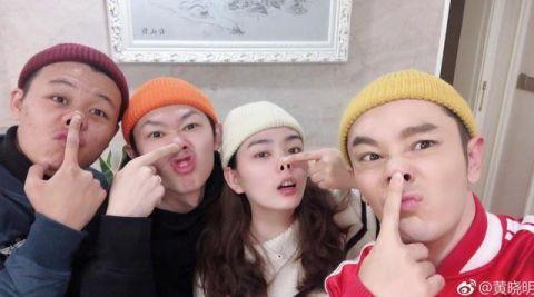 三个同事也戴着瓜皮帽,用手指顶着自己的鼻子,扮演这猪猪侠。拍完第一张合影后,黄晓明意犹未尽和三个同事一起比手势又拍了一张合影。第二张照片中,四人同框但是造型各不相同。