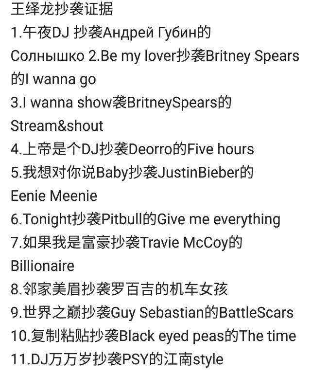 网友们细心的发现了王绎龙有许多的歌都是抄袭的其他音乐的旋律,自己加上有些土的歌词,就变成了王绎龙风格的音乐。比如王绎龙的《我想对你说Baby》的旋律和贾斯汀比伯的《Eenie Meenie》十分相似,《上帝是个DJ》又“撞脸”了《Five Hours》,《Tonight》又与Pitbull的《Give Me Everything》不尽相同。如果一两次还可以狡辩是巧合,那么这么多次怎么说呢?更何况抄袭的十分明显,几乎就是只改了歌词而已,不知道各位读者对这样的行为有什么看法?