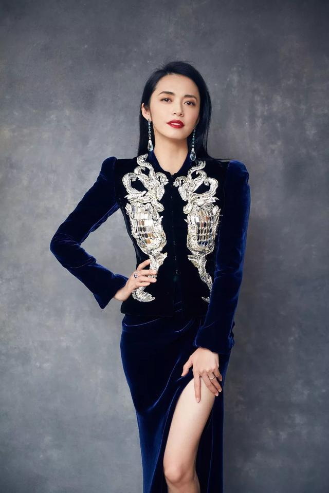 微博女王姚晨一席蓝色天鹅绒长礼服,搭配chopard萧邦的高级珠宝耳坠和戒指,黑发红唇气场全开,流露出大方、典雅的气质。