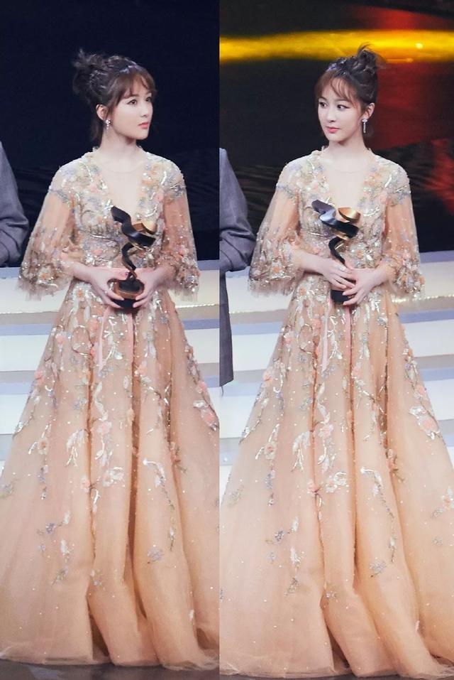 凭借热门剧《香蜜》获得“微博年度女神”的杨紫,细碎的刘海配上丸子头十分少女,当晚身穿宫廷风裸色刺绣礼服搭配,温婉的小仙女一枚。