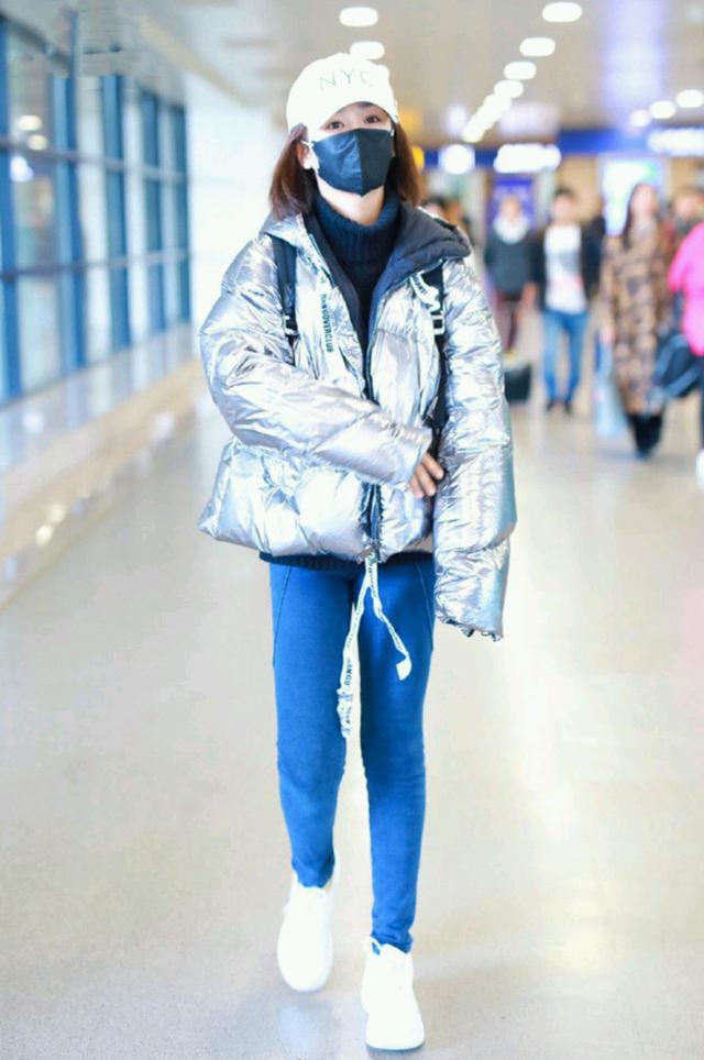 杨紫身穿黑色高领毛衣,外搭银色金属面羽绒服,未来感十足!搭配牛仔裤,穿白色运动鞋,戴白色棒球帽,白颜色的点缀非常亮眼。