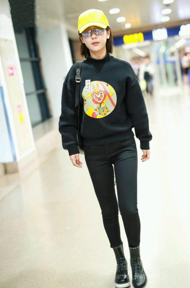杨紫身穿黑色小高领卫衣,胸前的图案真的是猴子孙悟空,搭配黑色紧身裤和黑色的直筒靴,戴亮黄颜色的棒球帽,戴镭射镜面圆墨镜,挎着单肩小黑背包,既是酷女孩又是幼稚园小朋友。