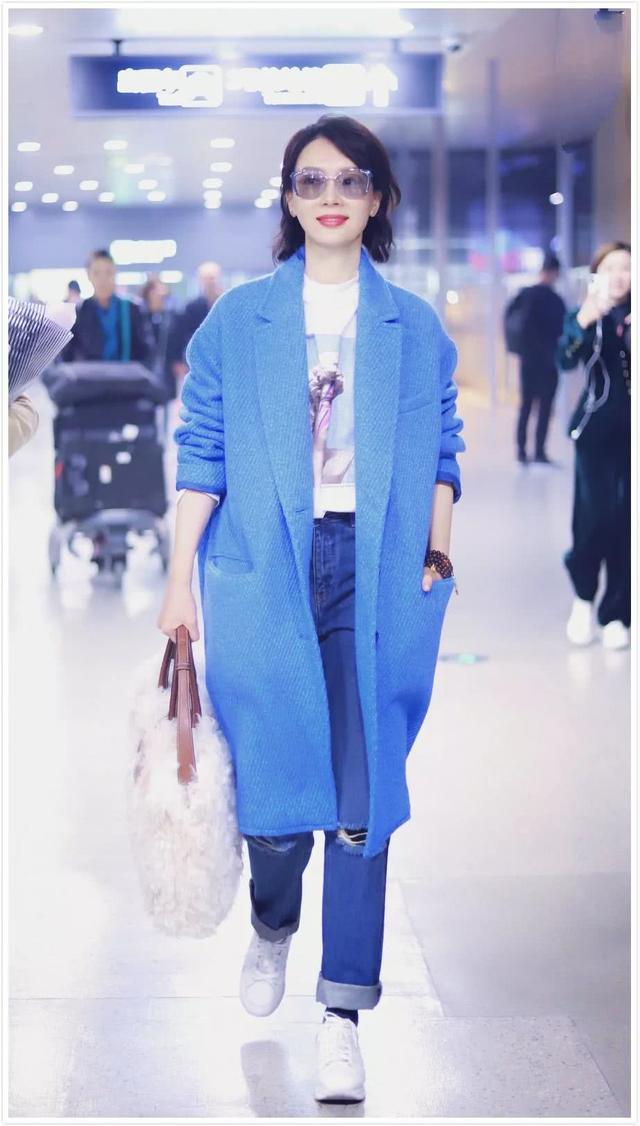 蓝大衣搭配白色的T恤,破洞牛仔裤,白色的运动鞋,再用毛绒绒的手提包做点缀,高级气质中又透着少女感!为了保暖,陈数还穿了黑色的打底裤,从破洞里若隐若现的黑色,还挺时髦的!