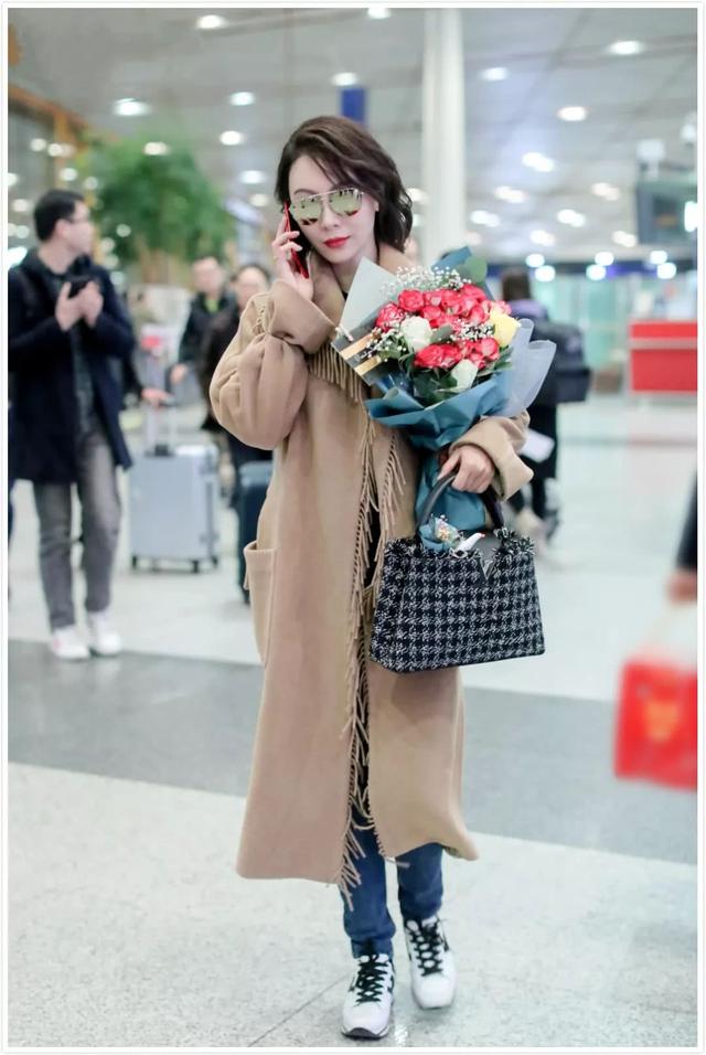 棕色的流苏睡衣款长大衣,搭配牛仔裤,运动鞋,让陈数穿出了慵懒的高级风!很多人穿这种款式的大衣,不是太瘦撑不起来,就是太胖撑的太圆,但陈数穿却美的刚刚好!这么好的身材,肯定源自于她多年的身材管理!