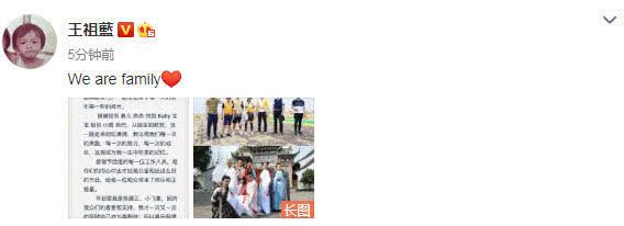 话说,对于这档接连5年时间都参与录制的节目,从王祖蓝的长文中也能感受到他离开兄弟团成员很不舍,所以,文章开头他也是喊出“We are family”这句话。