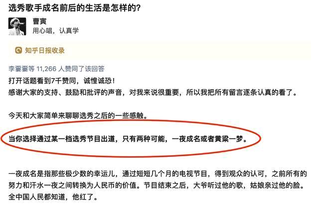 当然更多的人则是已经完全淡出了人们的视线。前段时间《中国好声音》的学员曹寅回答知乎上“选秀歌手成名前后的生活是怎样的”这个问题,引发了不少关注。在回答中他写道“当你选择通过某一档选秀节目出道,只有两种可能,一夜成名或者黄粱一梦。”