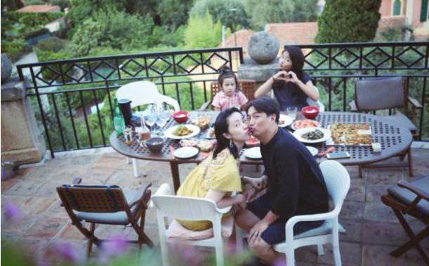 这是一家人在外聚餐时的照片,夫妻两个结婚多年依然就像热恋的情侣一样亲着嘴,后面的小女儿表情十分可爱,多多还比了一个心。