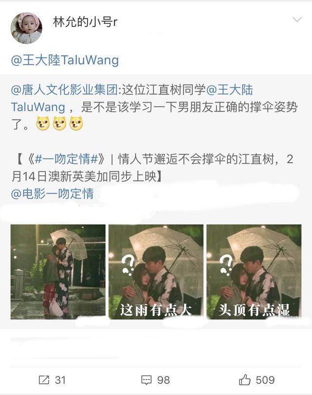 不过,仔细一看,浪漫是挺浪漫的,但女主角湘琴似乎没有在雨伞的庇护下呀。这雨水是肆无忌惮的飞落在湘琴的身上,男朋友直树同学是不是该学学正确的撑伞姿势了?怪不得林允同学要直接点名王大陆呢。