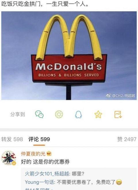 有细心的网友发现,杨超越在2017年的10月27日发布了一篇微博,说到“吃饭只吃金拱门,一生只爱一个人”,并配了一张麦当劳的标志“金拱门”,