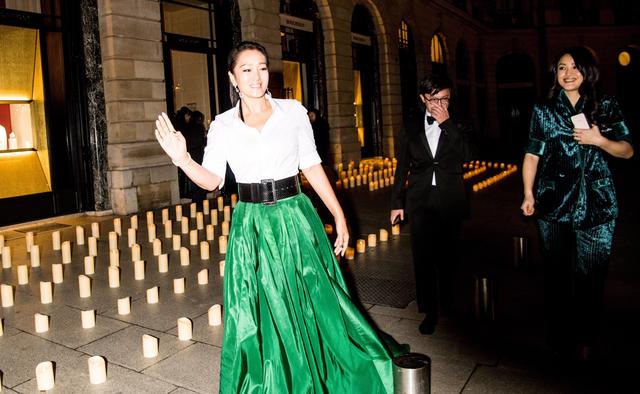 这身裙装配色上其实就不错,白色和绿色搭配比较清新,也是很活力的配色,自然而然让五十多岁的巩俐也更清爽减龄,美得耳目一新一些。另外这条裙子是高腰设计,绿色裙摆显得下半身修长许多,让巩俐身材更显高挑,人也霸气许多。如果你想要显高或者有气场,也可以选择这种高腰款式的连衣裙。