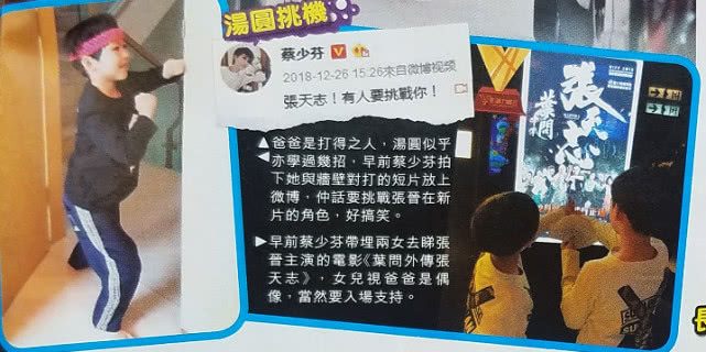 妈妈用心良苦,两个女儿也乐意接受改变。一直以来非常仰慕爸爸张晋的汤圆,最近开始跟爸爸学咏春。早前蔡少芬在微博上载了一段汤圆对着墙练功的短片,扎着头巾的汤圆十分有型,动作有板有眼,果然是虎父无犬女。蔡少芬更搞笑地说:“张天志!有人要挑战你!”