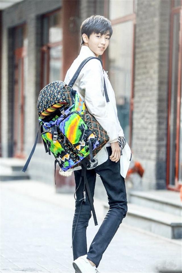 第四张:王俊凯在这张照片里穿了一个白色的风衣外套,穿一个黑色的裤子配上一个白色的球鞋。这张照片里最突出的就是他背的那个花色的背包,那个包包上面有许多的卡通图案为深色的包增添了许许多多的活泼感,十分的可爱。这个背包让整个画面赋予了满满的热情和动力。