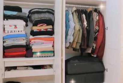 包文婧看到后随之动手开始收拾,满柜子的衣服拿出来重新叠起来,经过近两个小时终于摆好,看起来是整洁不少。