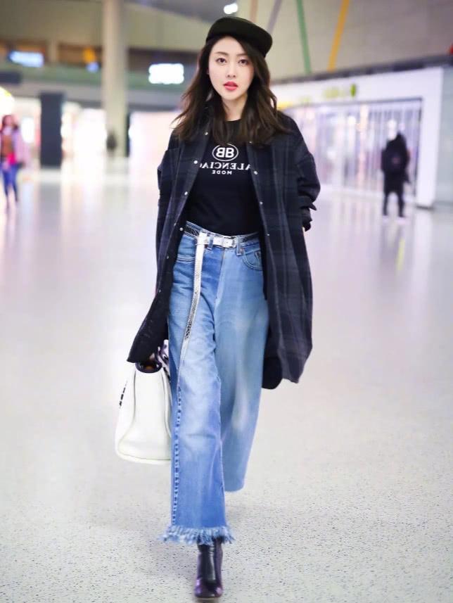 张天爱身穿一件灰黑色的格子外套,内搭一件黑色的印花上衣,白色的印花打破了黑色的沉闷感。搭配一条水洗牛仔阔腿裤,系上个性腰带,轻松拉长腿部比例,展现腿长优势。脚踩一双黑色的短靴,手拎白色的包包,头戴黑色贝雷帽,酷感十足!