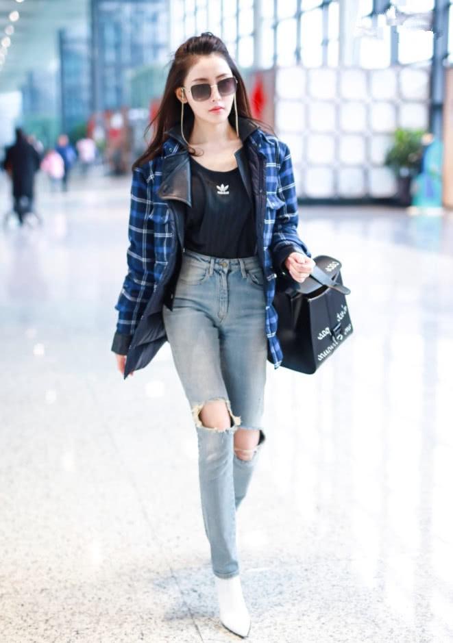 张天爱身穿一件蓝色的格子棉衣,内搭一件皮质外套,内搭一件黑色上衣,轻松打造丰富的层次感。搭配紧身破洞牛仔裤,脚踩白色的尖头高跟鞋,尖头的鞋子比较显瘦又显高。手挎黑色印花包包,女神气场十足!