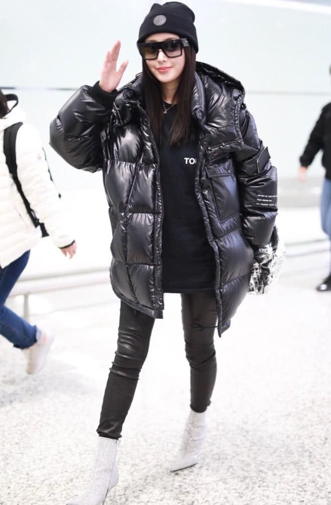 张天爱身穿一件黑色的羽绒服,内搭一件黑色上衣,搭配黑色的皮裤,头戴黑色毛线帽,佩戴方形墨镜,酷感十足。银色的尖头高跟靴,为一身暗色系增添了一抹亮色,让整体造型看起来不会显得那么沉闷!