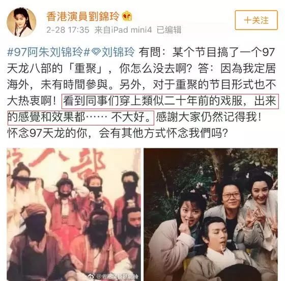 《天龙八部》主创演员齐聚,却不见当年的阿朱,热心的网友纷纷跑到她的微博下留言询问为何不来,扮演阿朱的刘锦玲给出的答复也着实让人扎心,她直言不喜欢此类节目,穿上20多年前的戏服感觉也不太好,对于这样的回答,小编只想说,哎呀,阿朱姐姐,瞎说什么大实话啊!