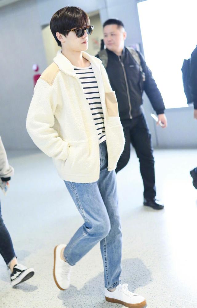 杨洋的这身穿搭很是清爽,他穿着白色羊羔绒棉服,内搭黑白条纹上衣,看起来温暖又舒适,再搭配高腰的牛仔裤,简约范儿十足,脚踩的白色小鞋,也是时髦,整体造型看起来很是舒服。