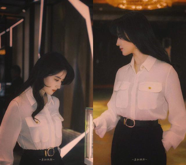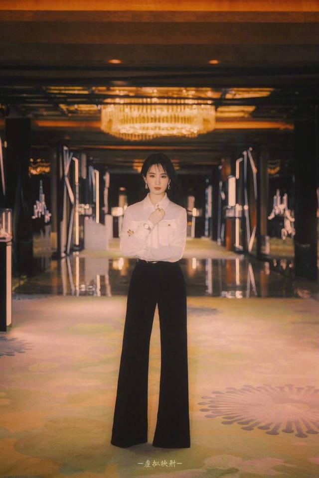 她真是长了一张怎么拍都好看的脸,而且这个发型还很显年轻,后面是黑色的大波浪卷发,表情呆呆的她美成了一幅画,刘亦菲身穿白色衬衣和黑色的阔腿长裤,她的气质很适合这种中性风的打扮,裤子版型非常好,垂直挺括,看上去高级的同时也显得倍有精气神了。
